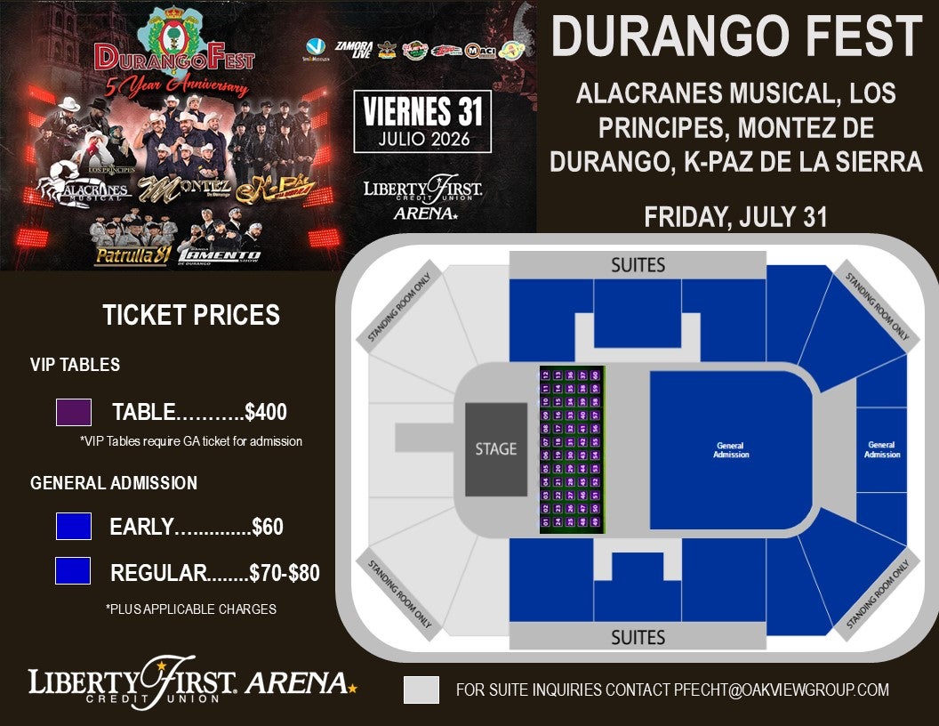 Alacranes Musical, Los Príncipes, Montez de Durango, K-Paz de la Sierra coming to Liberty First Credit Union Arena on Friday, July 31, 2026!